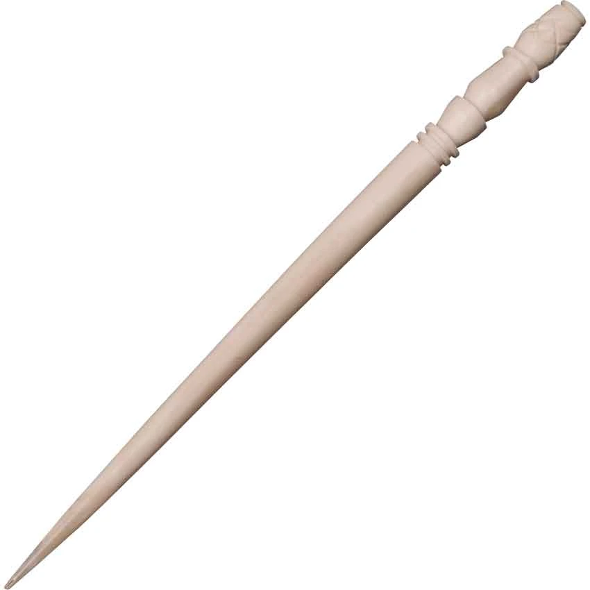 If you wish to give yourself a historical hairdo, then you will need the right tools. Add the Fulvia Bone Hair Pin to your hairstyle. Made of real bone, this hair pin has a tapered shape based on a historical Roman pin. Its tapered shape gives the pin a more streamlined look. This streamlined look works well with a variety of characters and genres. Grooves, ridges, and crosshatching adorn the wider end of the pin. The pin has a carefully polished finish. This bone pin comes individually, allowing you to get as many as you need for your desired hair style. The hair pin works great for reenactments as well as LARP and cosplay events.