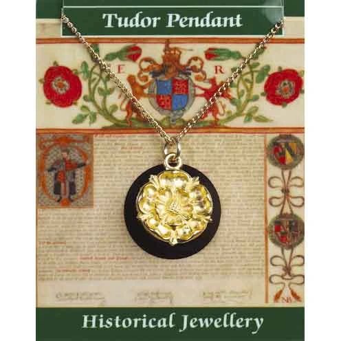 The Gold Plated Tudor Rose Necklace depicts a heraldic flower that Henry VII would later adopt as the symbol of the Tudor Dynasty. The pendant comes with a full-color information card, which features a brief history of the Tudor line on its back. Historically, Henry VII created the Tudor Dynasty when he ended the War of the Roses, which was between the House of York and the House of Lancaster. Henry VII also created the Tudor Rose by combining the White Rose of York and the Red Rose of Lancaster, merging the two into one elegant flower. The pendant depicts two flowers, one inside the other (always seen as the white, on top of the red), while each flower always features five distinct petals. The pendant is made from lead-free pewter and plated in 22ct gold, and it is supplied on a waxed cord for easy wearing. This Gold Plated Tudor Rose Necklace is a simple and attractive design, as well as a meaningful one that is certain to capture the interest and eye of all those who see it.