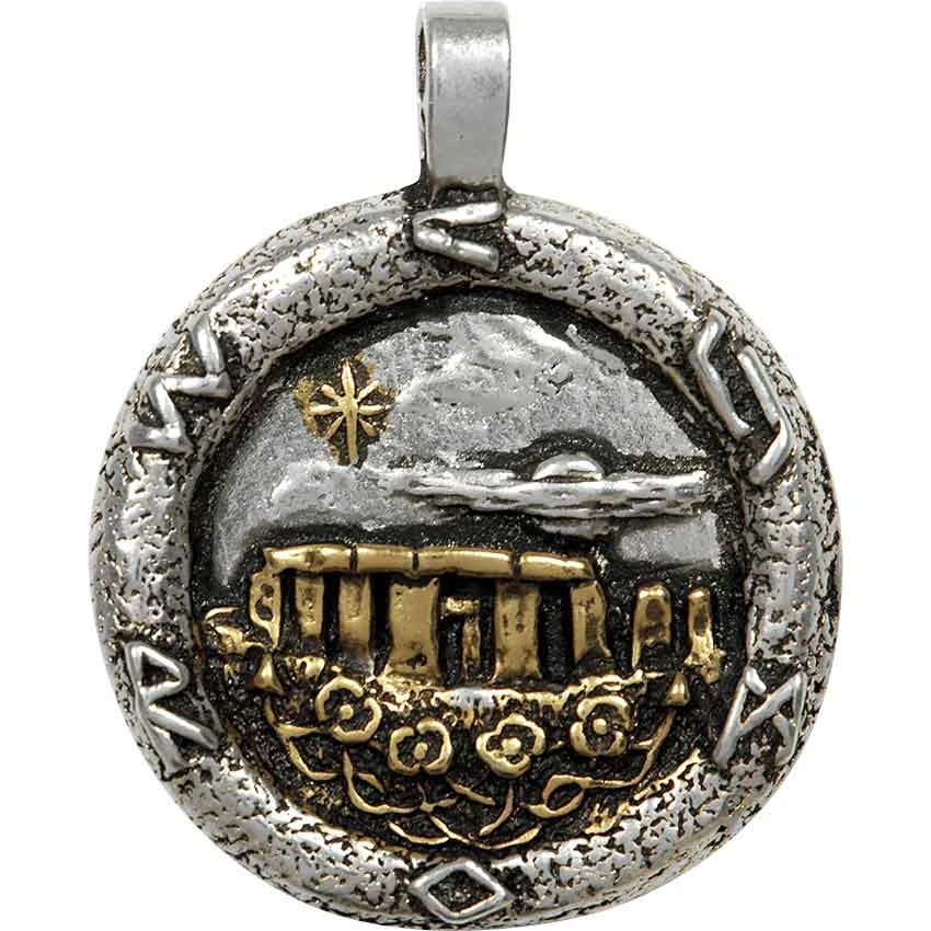 One of the most famous prehistoric monuments, Stonehenge is an inspiring sight. Add it to your outfits with the Golden Stonehenge Necklace. Made from pewter, this well detailed necklace features a side view of the famous ruins. There are some flowers below the ruins. Also, there is a star and a cloud covered moon above the ruins. The ruins, flowers, and star are gold plated. The rest of the circular necklace is silver plated. Around the Stonehenge design is a border with Futhark runes adorning it. Overall, the necklace comes with a silver-plated link chain as well as a black satin pouch and an informational leaflet. This necklace makes a unique personal accessory for any fan of history or mystical locations.