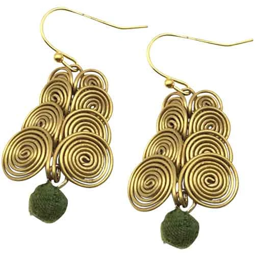Lend unique elegance to Viking looks with the Golden Swirls Norse Bead Earrings. A fabric-covered wooden bead hangs from the layered, gold tone swirls, creating a rustic yet refined vibe perfect for accessorizing a Norse lady look. Crafted by hand, the top spiraled-wire circles are attached to French hooks, forming a dangle style earring. Ear piercing is required to wear these earrings, and they are sold as a set of two. Because the beads are wrapped in recycled fabric, these Viking jewelry items may vary slightly from what is shown here. Wear these gold tone Viking earrings as part of a noble Viking ensemble, fantasy outfit, or even as a unique accessory for modern day fashion.