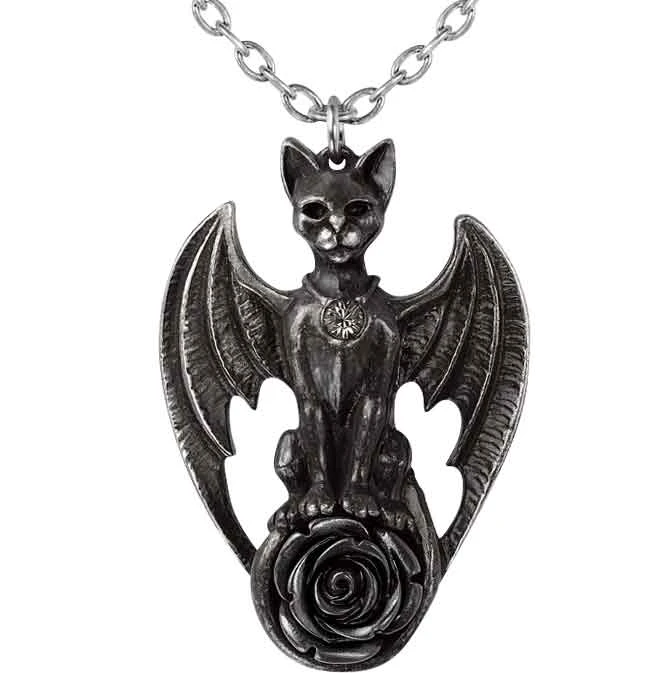 Then, the black necklace depicts a black winged cat. The cat sits on a black rose. Its bat wings end at the rose below it. There is a crystal on the necklace around the cats neck. This gothic cat necklace makes a wonderful addition to any gothic outfit or casual ensemble.