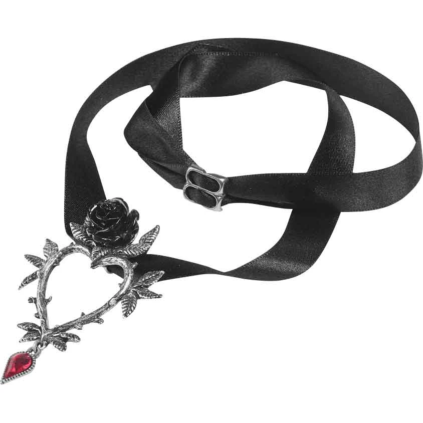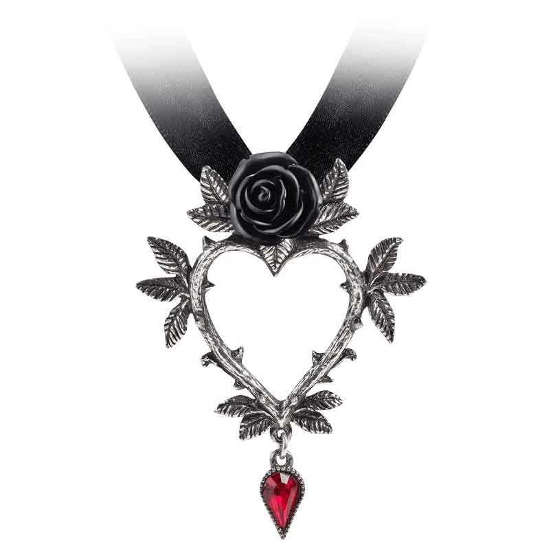 No matter if you love jewelry with a dark romantic style or a gothic style in general, you are sure to enjoy the Guirlande d’Amour Necklace. Made from pewter, this gothic necklace has a heart shape. Thorny stems form the heart with leaf detailing. At the top of the heart, the necklace has a black resin rose. Meanwhile, at the bottom of the necklace, there is a dangling red Swarovski crystal. It has an upside-down teardrop shape. This necklace comes on an adjustable black ribbon. The Guirlande d’Amour Necklace makes a great personal accessory and addition to a variety of gothic outfits.