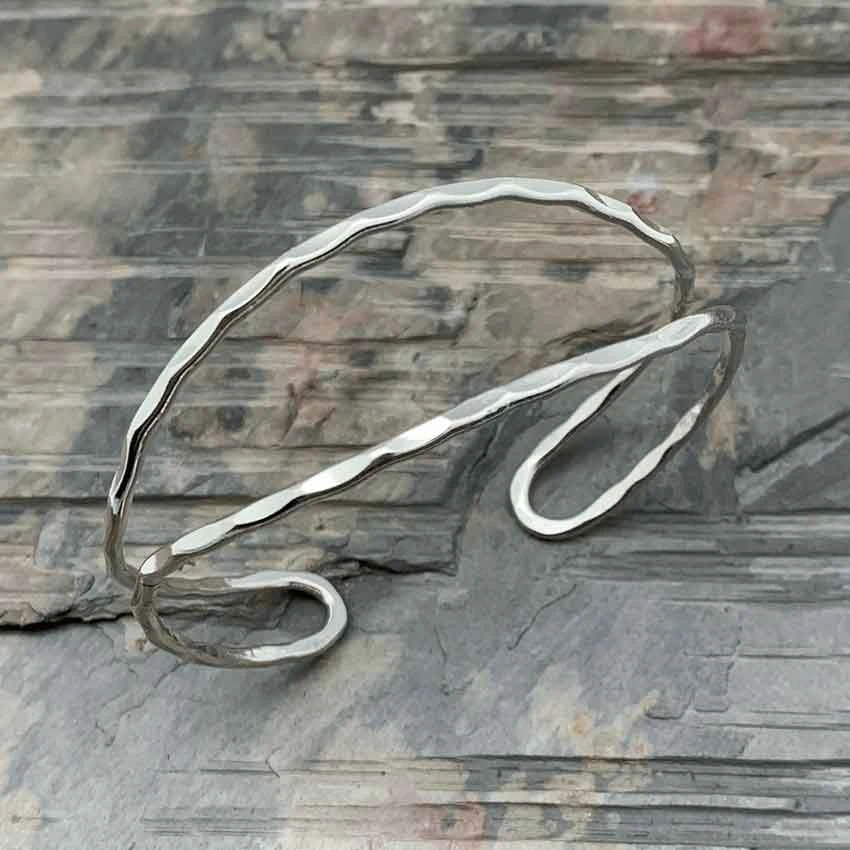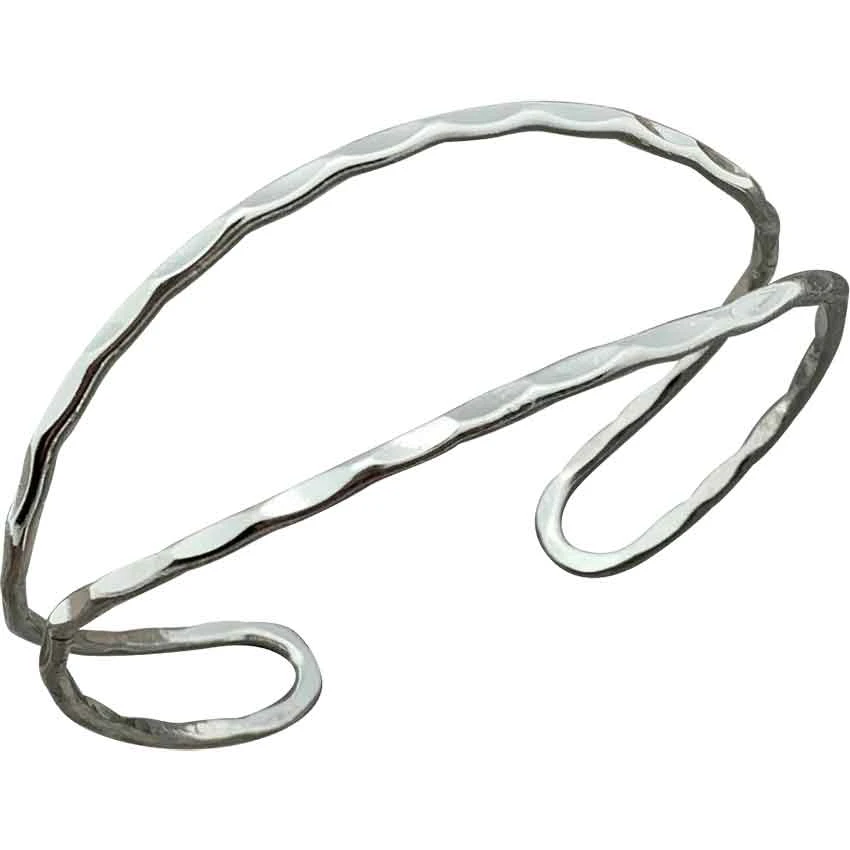 From medieval to fantasy and more, the Hammered Loop Medieval Cuff Bracelet fits a variety of styles for a perfect finishing touch. This handmade bracelet features a silver plating. It has a cuff style, meaning that it looks like an open circle from the side. It consists of a flat wire loop. The loop doubles back on itself creating a double band design with rounded ends. Also, the wire has a hammered finish. Add this medieval cuff bracelet to your daily wardrobe or jewelry collection.