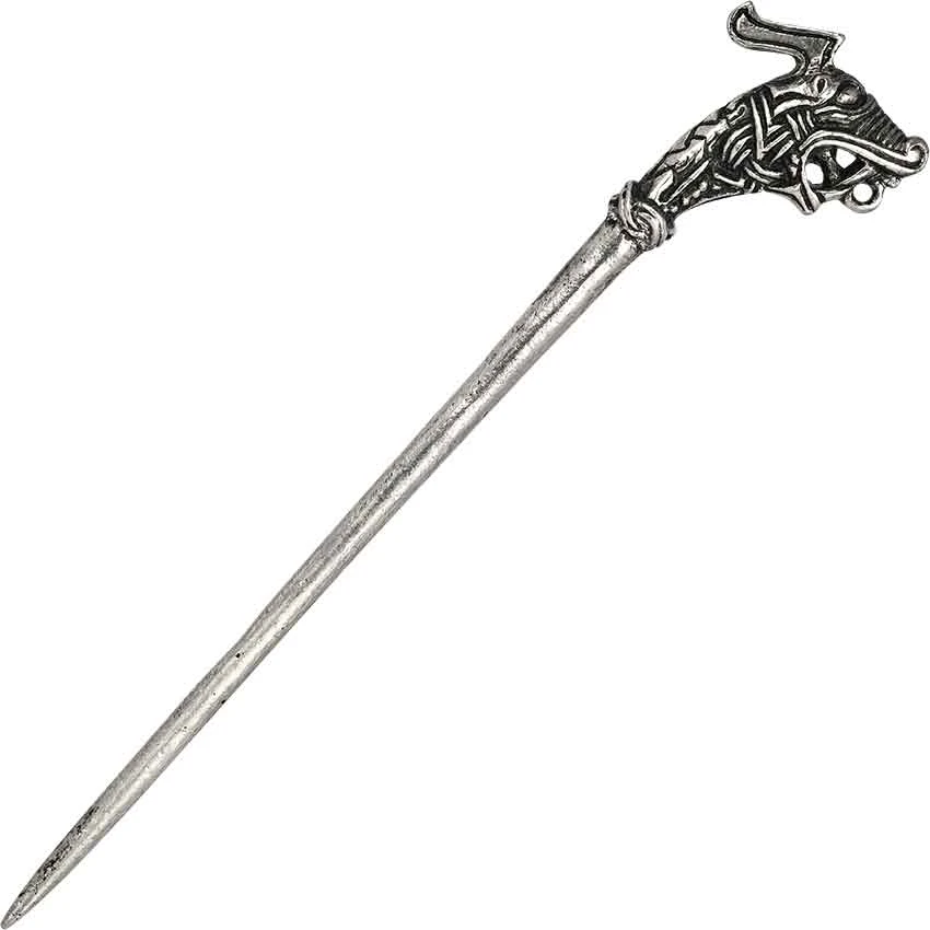 The dragon pin features a shaft with a decorated head on one end. The stylized dragon head has Borre-style knotwork detailing. Its mouth is open, creating a loop with its tongue. This loop allows for attaching a cord, not included. This Nordic pin has a versatile design and comes with care instructions. You can wear it in your hair as a Viking hair pin. It also works well as a Norse cloak fastener.
