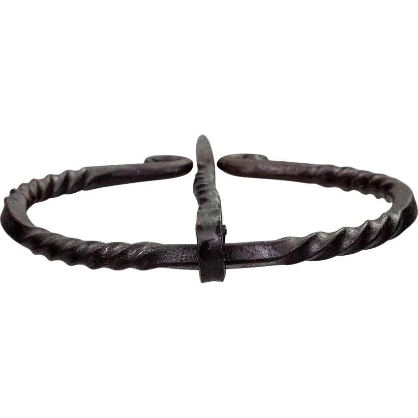 Accent your cloak, cape, shawl, or even a tunic with the Historic Penannular Brooch. This open ring cloak pin is handcrafted from wrought iron and has a twisted texture interspersed through its round frame and moveable, tapered pin. The penannular cloak pin has a small opening, its ends turned back into small loops. The attached, tapered pin can move along the Viking ring brooch for easily adjusting in place. Add historical style and function to your medieval, Renaissance, Viking, or fantasy outfit with this wrought iron historical brooch.