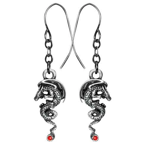 Fans of the manga Fairy Tail can appreciate the Igneel Dragon Earrings, designed after the Flame Dragon King. These dangling earrings show the dragon with a curled body and red accent at the tip of its tail. Each earring hangs from a short chain connected to the hook. Crafted from lead free pewter, the blackened details of this piece provide excellent visual interest. These earrings make a great gift!