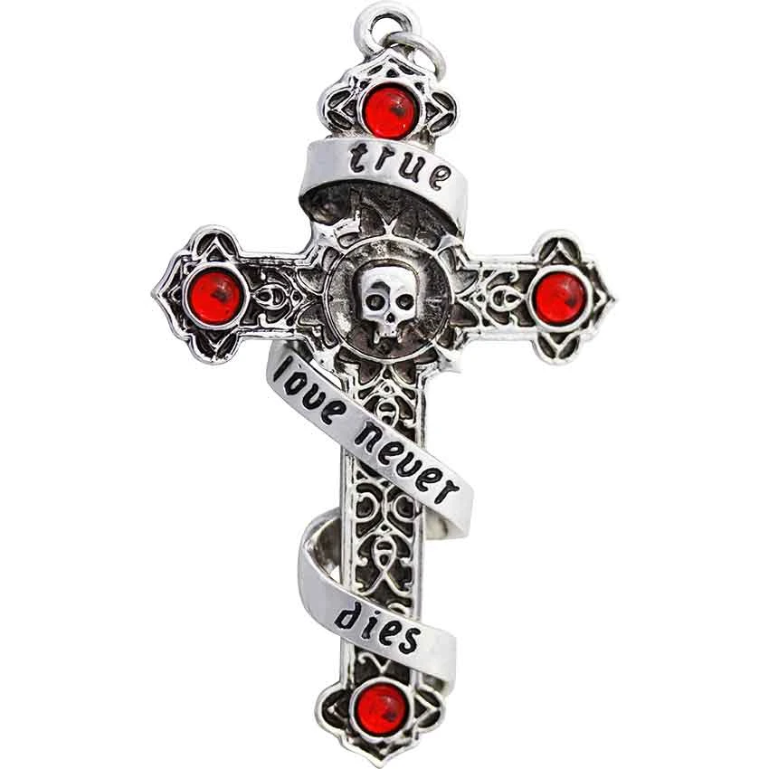 Love, some say, is everything, and being without a beginning or an end, is a universal concept that serves to enrich the world. This Infinitas Carpe Noctum Necklace represents that concept, bearing a message of how eternal true love really is. Designed by Anne Stokes, this elegant little pendant features a heavy touch of gothic style, featuring rich little detailing down its cross-shaped length. Little red cabochon gem accents adorn the terminals of the cross, while a skull sits at its center. Wrapped around the length of the cross is a banner which reads True love never dies. The pendant is crafted entirely in fine pewter metal, which gives the cross an attractive, faded silver metal finish. The pendant comes complete with a matching metal chain necklace for easy wearing, as well as with a small jewelry gift box for easy and safe storage. This Infinitas Carpe Noctum Necklace makes for a great token of affection to give to that gothic love in your life, as well as a stellar accessory for you to wear when it comes to seizing the style that you desire most.