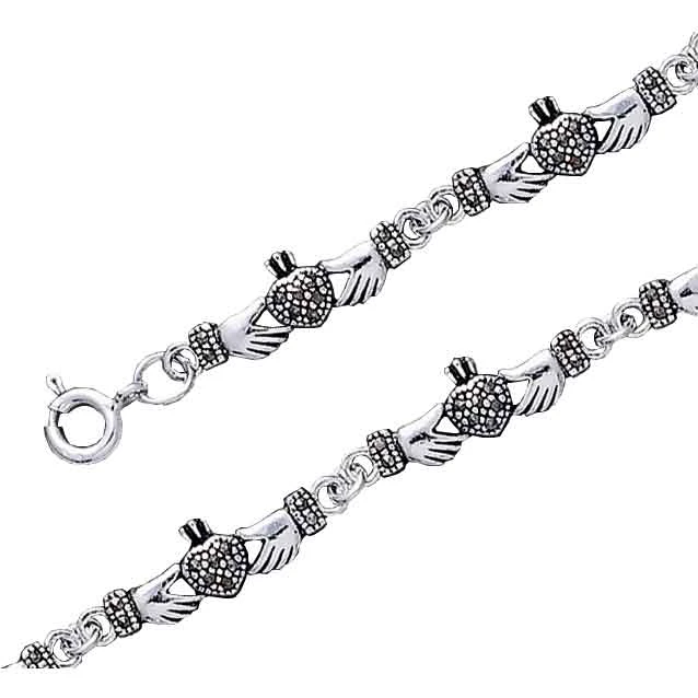 The Claddagh is a traditional Irish symbol of love, friendship, and loyalty with the three design elements of the heart, hands, and crown. Dating back to the 1600s the Claddagh is still a popular token of love and Irish heritage today. The Celtic Knotwork Collection celebrates Celtic heritage and captures the intricate knotwork designs that have inspired mankind for ages. Meticulously crafted from fine sterling silver with shimmering marcasite accents, the Irish Claddagh with Marcasite Silver Bracelet showcases the beauty of Celtic tradition.