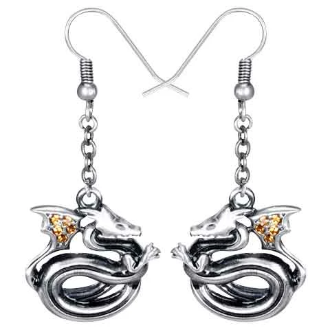 - Earrings depict swirling wyvern style dragons with golden and silver jeweled wings