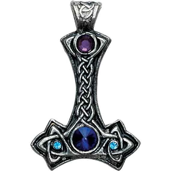 As volatile as the Norse god of storms could be, Thor was still seen as a guardian of mortals. As such, his hammer was, and still is, worn as a protective charm, and in this Jeweled Thors Hammer Necklace, it is quite the appealing little accent, too. This appealing charm recreates the classic design of Thors iconic hammer, featuring the hammer shape adorned with twisting Celtic knots that only enhance its appeal. Even more striking, though, are the Swarovski crystal elements on the pendant. A single purple one rests at the tip of the haft, while three more adorn the hammer head, two in light blue and one in a darker hue. The pendant is, otherwise, crafted entirely in fine, lead-free pewter metal, and it comes complete with a fine metal chain and a jewelry box for easy storage. The Jeweled Thors Hammer Necklace is an absolutely stunning accessory, one that binds the protective potential of an old-world Viking talisman to the appeal of modern jewelry, creating a new little trinket that can confer personal and spiritual protection, as well as great personal style, too.