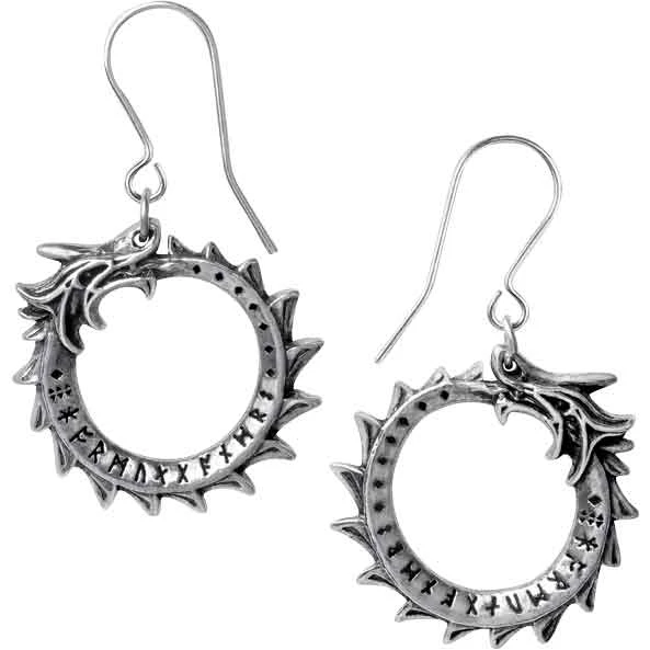 Add a touch of Norse mythology to your favorite ensemble by wearing the Jormungand Earrings. They are a great choice for some Viking style. Made from fine English pewter, these Norse earrings come as a pair. They have fishhook backings, which require pierced ears. Each earring features a depiction of the World Serpent from Norse mythology. It shows Jormungandr biting its own tail. Along the Viking style serpent are Norse runes. The hooks attach to Jormungandr at its nose. You can easily wear them with any Viking outfit or add them to a Norse jewelry collection. These earrings look great worn with the Mini Jormungand Necklace (AG-P918), sold separately.