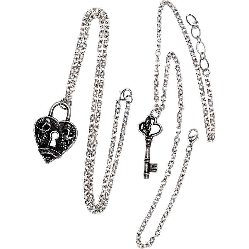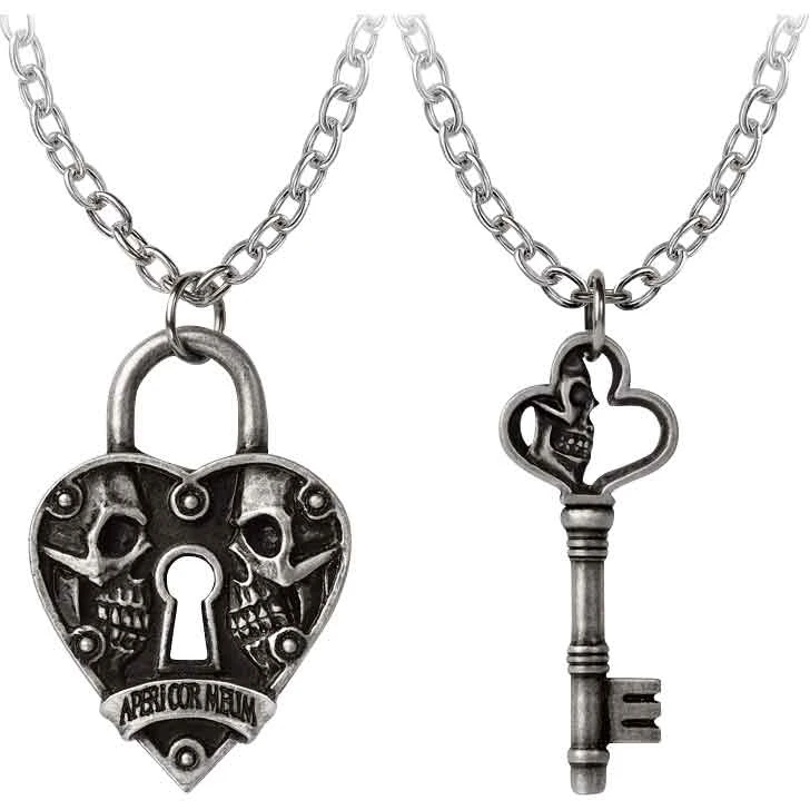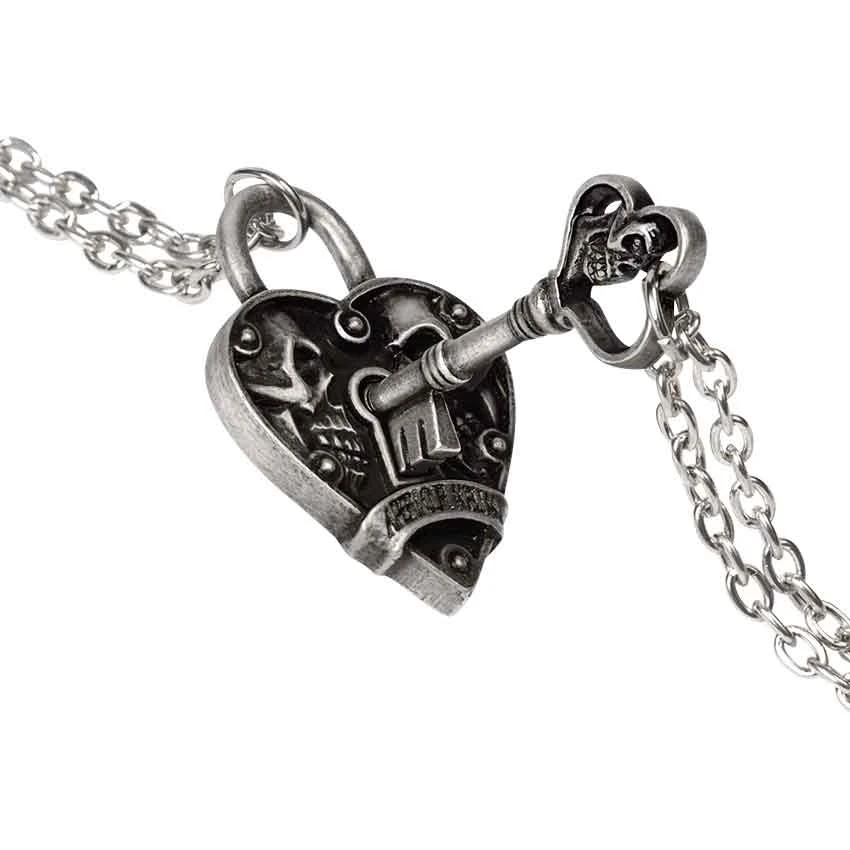 Unlock your love with the Key to Eternity Couples Necklace Set. Perfectly suited to each other, this lock and key necklace set beautifully shows love in a way that suits your unique gothic style.