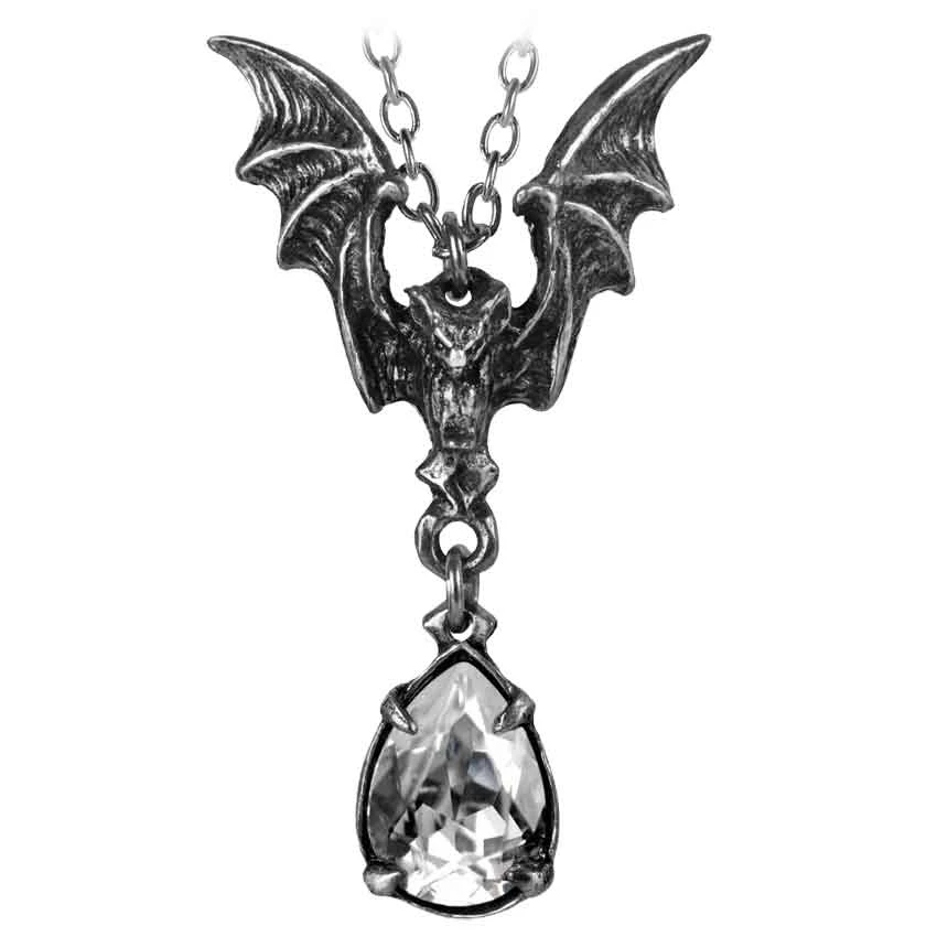 The night can hold such treasures for those who have the fortitude and bravery to withstand its influence and its denizens. Borne on ghastly wings, La Nuit Necklace brings forth one such treasure with its glimmering crystal. The twisted visage of a night-terror is the face of this pendant. Similar to a bat in several ways, the face of this creature is not quite right, gnarled into a form that one could only perceive in the deepest dark, well-after twilight has ended. But as terrible as it is, this creature is but a messenger and a gift-giver. It brings with it a single tear-drop shaped crystal, pale and glittering. This is the reward that those who brave the night receive, delivered on the wings of La Nuit.