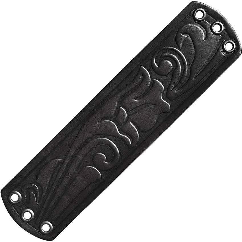 Be sure to bring a touch of nature to your medieval or fantasy costume by including the right accessory like the Leather Floral Bracelet. Made from premium leather, this bracelet comes in two colors. It has a rectangular shape with curved sides. There are three metal grommets along each side. They are brass-colored for the brown option and silver-colored for the black option. The grommets allow the bracelet to lace onto the arm. Laces do not come included. A large, embossed bell-shaped flower adorns the center of the bracelet. Its stem angles towards one side with scrolled details next to it. Similar scrollwork fills in the rest of the bracelet on the other side. The Leather Floral Bracelet makes a great finishing touch to a variety of ensembles for LARPing and cosplaying.