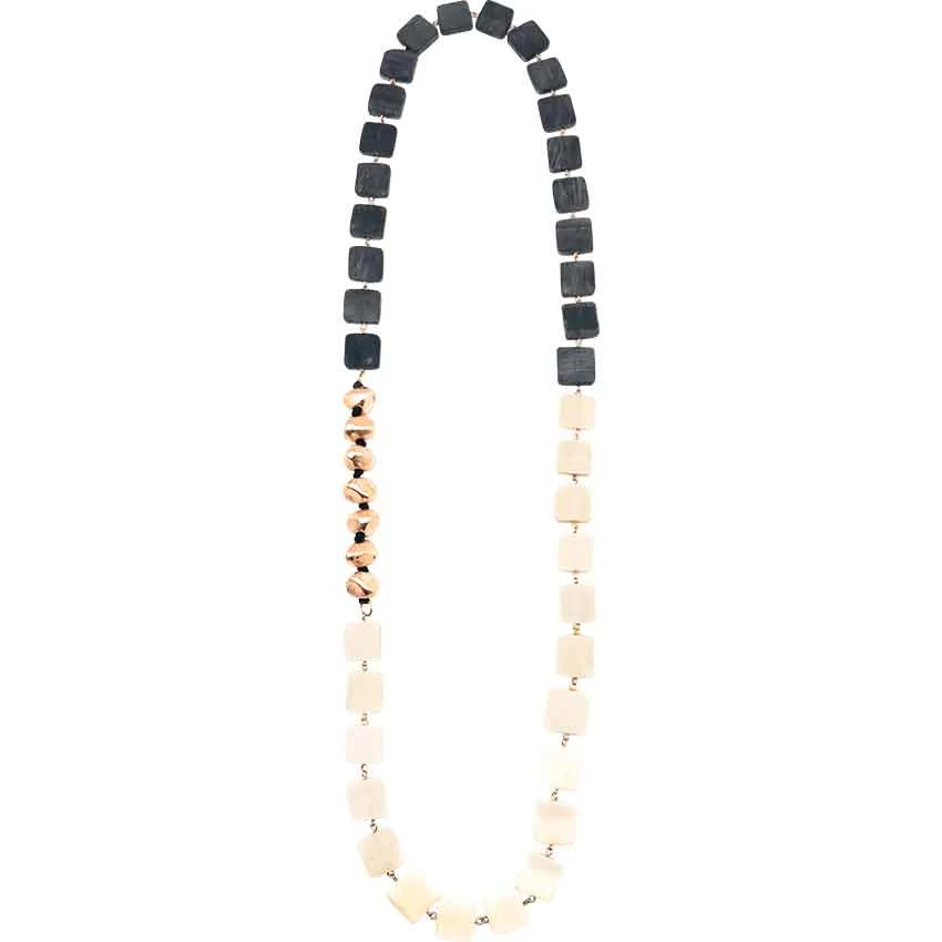 If you are wanting a distinctive accessory to add to your jewelry collection, then check out the Light and Dark Horn Viking Necklace. Made from horn, this necklace consists of horn and copper-colored beads. The horn beads are square in shape. Half of them are a light color of horn while the other half are dark in color. Between each horn bead are two loops connected to each other. The copper-colored beads take up a small portion of the overall necklace. Each bead has an irregular shape, similar to a nugget of metal. They come on a black cord. The cord ends in loops which connect it to the rest of the necklace. Also, this necklace slips on over the head. You can wear this horn necklace with any number of Viking ensembles. It also looks great with a modern style outfit as well.