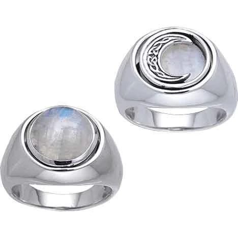The Flip ring is two rings in one, allowing the wearer to choose which design they want to display at any given time. With the innovative flip design, you will be doubling the value of your purchase AND doubling your style! This magical sterling silver flip ring is embedded with a synthetic moonstone on one side, while the other side is adorned with a crescent moon filled with intricate Celtic Knotwork. The moonstone is used to balance emotions and enhance psychic powers.