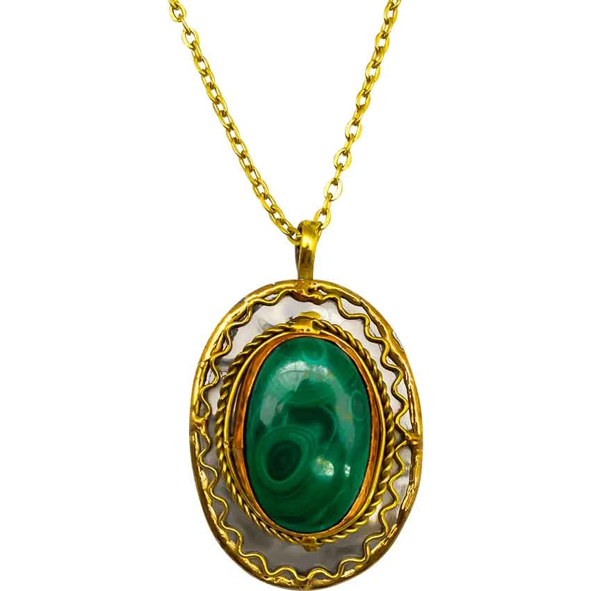 When you are looking for a necklace to go with your medieval costume, make sure to check out the Malachite Ripple Medieval Necklace. Made from stainless steel, this necklace has an oval shape. At the top of the oval, there is a bale for sliding it onto the included brass chain. In the center of the necklace is an oval malachite stone. Around the stone is a copper border surrounded by a spiral brass border. A wavy brass border runs along the edges of the necklace. This necklace looks great with a variety of styles. It wonderfully matches the other Malachite Ripple jewelry pieces, sold separately. You can wear this necklace with a variety of styles and outfits, including modern ones.