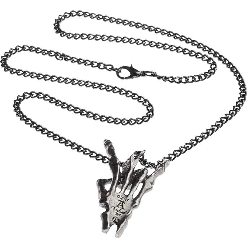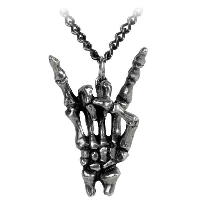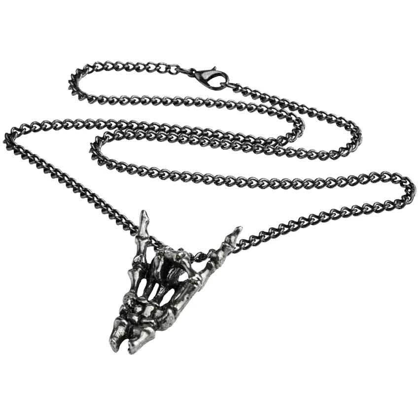 The Maloik Sign of the Horns Maschio Necklace is a gothic twist of the classic rock salute. With a rebellious air, the skeletal hand responds to the Evil Eye of death, refusing to accept the ill intent or bad luck, it seeks to invoke. The skeletal hand forms the Sign of the Horns, perfect for warding away evil spirits or saluting your favorite heavy metal band. The detail on this pewter jewelry piece is quite impressive. The fleshless appendage possesses an antique finish, and the branding of its maker engraves the back. Fasten it easily around your neck with the included trace chain. Unleash your rebellious side with the Maloik Sign of the Horns Maschio Necklace.