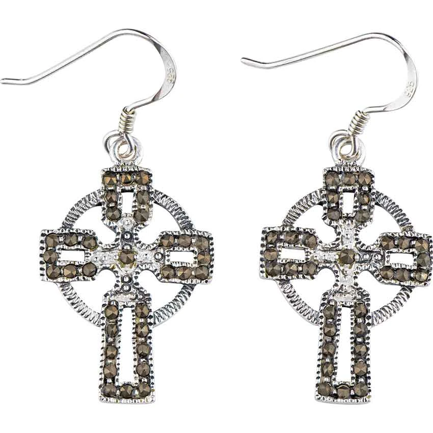 The cross symbolizes spirituality and the bridge to other worlds, serving as a popular feature of Celtic art. The Marcasite Celtic Cross Earrings display a cross with thick bars that thin near their intersection. Each bar has cutouts with marcasite accents decorating the edges. A nimbus forms around the intersection as an additional detail. These hook earrings make a fantastic personal accessory or gift for a loved one. Made from white bronze, they are plated with sterling silver.