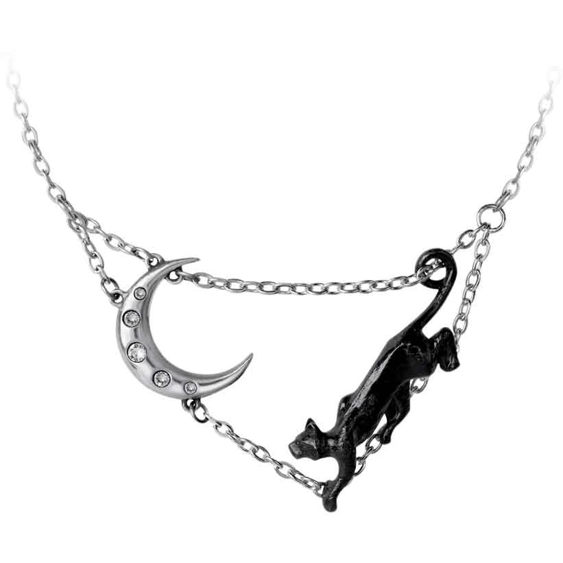 If you are looking to add a necklace to your jewelry collection or gothic costume, the Minnaloushe Necklace is a wonderful choice. Inspired by a poem by William Butler Yeats, this gothic necklace has a mystical style. Made from fine English pewter, this necklace depicts a black cat and a silver-colored moon on a pair of chains. The cat appears to look up at the moon. Its tail forms a loop at the end which wraps around the upper chain. Meanwhile, there are five clear Swarovski crystals adorning the crescent moon. The two chains connect to the moon with small loops. The chains form one chain that goes around the wearers neck. Whether you are a fan of Yeats, cats, or anything with magical style, this necklace makes a great personal accessory. Add the Minnaloushe Necklace to a variety of outfits and ensembles.