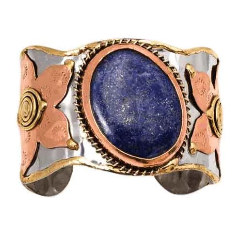 Let your beauty bloom when you wear the Mixed Metal Lapis Cuff Bracelet. Featuring a large lapis lazuli stone at its center, this artisan cuff bracelet is further accented with whimsical floral details in copper and brass tones. This nature inspired bracelet can be gently adjusted for best fit, and its mixed metal appearance will match a wide variety of outfits. Perfect for fairy inspired fashions and springtime ensembles, this gemstone bracelet has a unique rustic aura that adds to its overall aesthetic. The edges of the bracelet cuff are slightly wavy and accented with brass tone bordering. With an intricately detailed artisan style that is all its own, this charming lapis lazuli bracelet makes a unique personal accessory or special gift for a loved one.