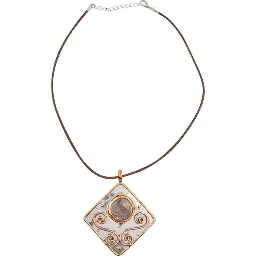 A fusion of metal and form is what awaits those who take a look at this Mixed Metal Scrollwork Necklace. Merging the hard gleam of polished metal with the soft curve of scrollwork lines, this pendant is a truly elegant accessory for any girl to own. This pendant is an attractive combination of various metals, merging several hues into one stunning design that is sure to catch the eye. The pendant is shaped like a geometric diamond made from polished stainless steel and rimmed with handsome brass metal. The interior of the pendant is decorated with a single copper setting, which is occupied with a stone, along with a pair of copper scrollwork curls. The pendant is capped with a small loop that easily accommodates a variety of chains and necklaces, and it also comes complete with an 18 inch long brown leather cord, so that it can be easily worn right out of the box. Completely artisanal, this Mixed Metal Scrollwork Necklace is a hand crafted item that allows any lady to add in a touch of intriguing beauty to her attire with all the ease of just putting on a necklace.