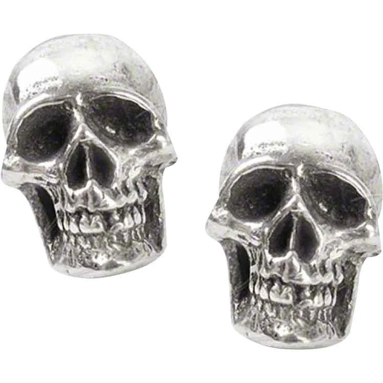 Stare deeply into the oblivion of long-passed mortal existence with the macabre faces depicted in these earrings. The Mortuarium Skull Stud Earrings show off the grinning specters of these unfortunate souls. The skull earrings are rendered with impressive detail, revealing iconic blackened eye sockets and hollow cheeks. The teeth simulate eerie grins that may send a shiver down your back. Crafted from the finest English pewter, these gothic stud earrings make a fine accessory during Halloween or a year-round option for spooky attire!