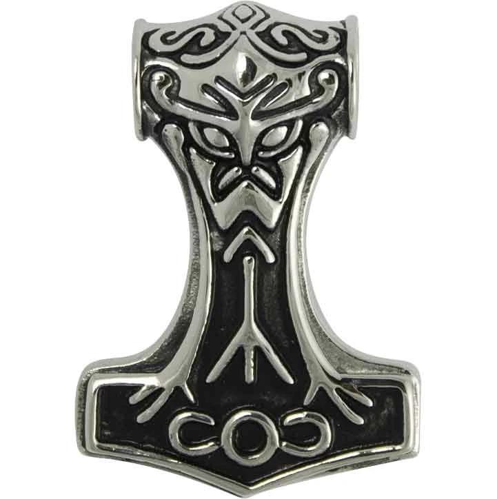 On the back, there are engraved, geometric shapes. The bottom has two scrolled S-shapes against a black background. This Viking pendant makes a wonderful addition to any Norse jewelry collection or outfit. You can wear the Mystic Mjolnir Pendant with your favorite ensemble.
