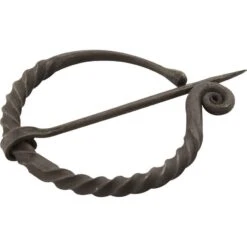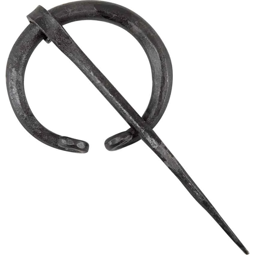 Vikings traveling through cold climates need to ensure that their cloaks are secured. They would use a pin like this Ninth Century Penannular Brooch. This wrought iron pin has a streamlined appearance that is perfect for a variety of characters and costumes. Many people from different eras and social classes wore similar pins and brooches. This brooch fastens with a long pin that extends past an open ring. The ends of the open ring tightly coil into spirals. The spirals face the top where the pin slides around. The unpolished finish showcases the forged appearance of the brooch. It is wonderful for cosplay conventions, LARP events, and reenactments.