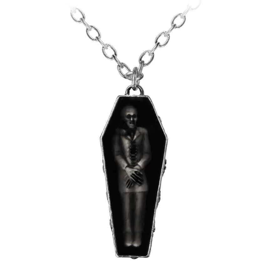 The Nosferatus Rest Necklace displays this iconic figure encapsulated within a smoke glazed pewter coffin. This Prince of the Night retreats daily to this deathly box before the first rays of the sun creep over the horizon. One of the most well-known vampires of all time, Nosferatu knows how to strike fear into the heart of his prey. Do not succumb to his hypnotic power. Instead, use this gothic necklace as an amulet to ward off his bloodthirst! Crafted by hand in the finest English pewter, this gothic pendant possesses a brilliant gleam that makes it a stunning gothic accessory to add to any ensemble.