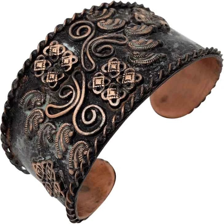 When you are an elegant noble, wealthy merchant, or another character, add the Patina Filigree and Wave Medieval Bracelet to your outfit. This copper bracelet has an open cuff design. This makes it slightly adjustable. It features a dark, almost black patina on the outside of the band. The band has spiral edges. Inside the band, there are many designs. There are thin wavy lines that each end in a spiral. There are filigree-style square shapes. Also, the band has sets of lines that form wave or shell-like shapes. This bracelet cuff brings a great finishing touch to any medieval, fantasy, or modern-day look.
