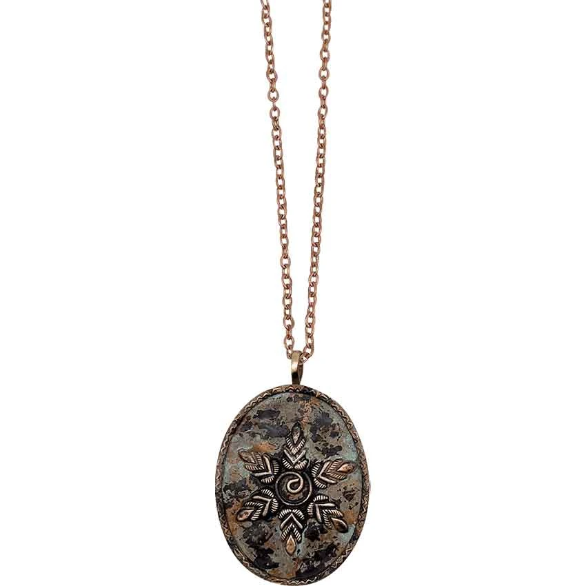 Wish that your adventurer or merchant character had a unique accessory? Make sure to check out the Patina Spiral Leaf Fantasy Necklace. This copper necklace has an oval shape with a bale at the top. The bale slides on the included copper chain. Meanwhile, the necklace features a brown patina. In the center, there is a copper spiral. There are six leaf shapes that radiate out from the spiral. This creates a snowflake-like design. This necklace brings a great finishing touch to any fantasy or modern-day look.