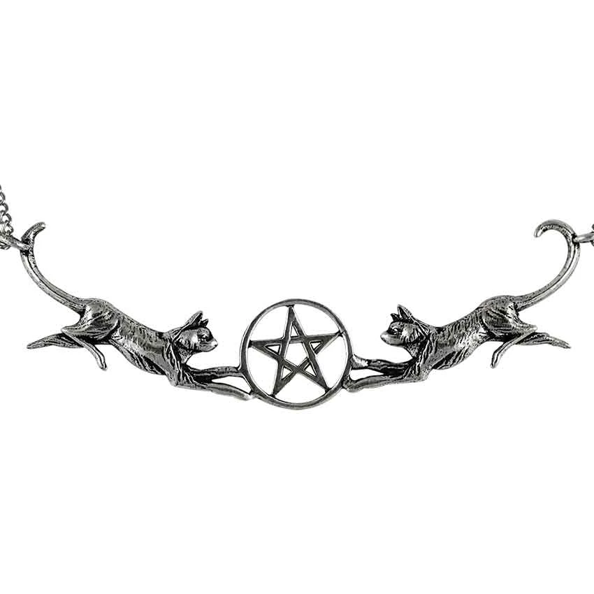 When you want to add some feline style to your witchy outfit, you should make sure that you check out the Pentacle Cats Necklace. Made from zinc alloy, this silver-plated necklace depicts two cats facing each other. In between the cats is a pentacle. A pentacle is a five-pointed star with interwoven sides inside of a circle. The cats touch the pentacle with their front paws. Each cat is stretched out with its tail curled upwards. Attached to each tail is an end of the necklace chain. This necklace comes with a satin pouch and an info card. The Pentacle Cats Necklace makes a great addition to any Wiccan jewelry collection or wardrobe.