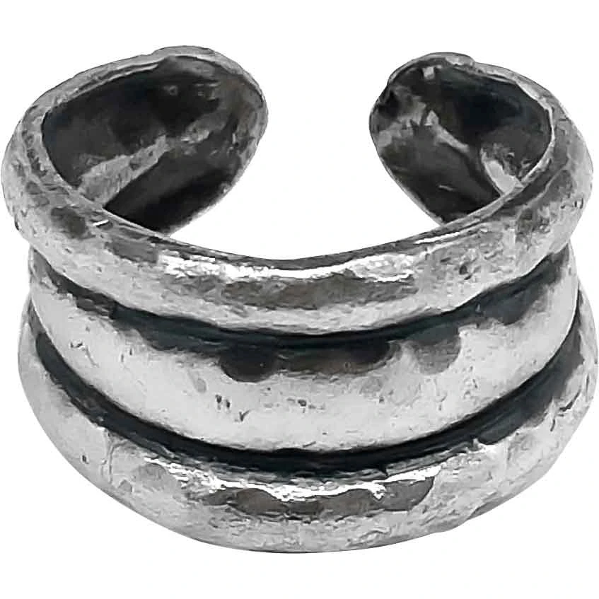 The Perette Silver Medieval Cuff Ring is a truly stylish accessory that looks great on the finger of a variety of characters and personas. Plated in antiqued silver, this cuff ring comes in one size. It has a cuff design which means that it looks like an open circle from the side. It features rounded ends. Also, near the ends, the ring tapers inward which creates a narrower band. Along the front, the ring has rounded borders at the top and bottom edges. Both the borders and center section have a hammered finish. Wear this cuff ring to a Renaissance festival, roleplaying event, or even a modern occasion. You can add it to your medieval jewelry collection.