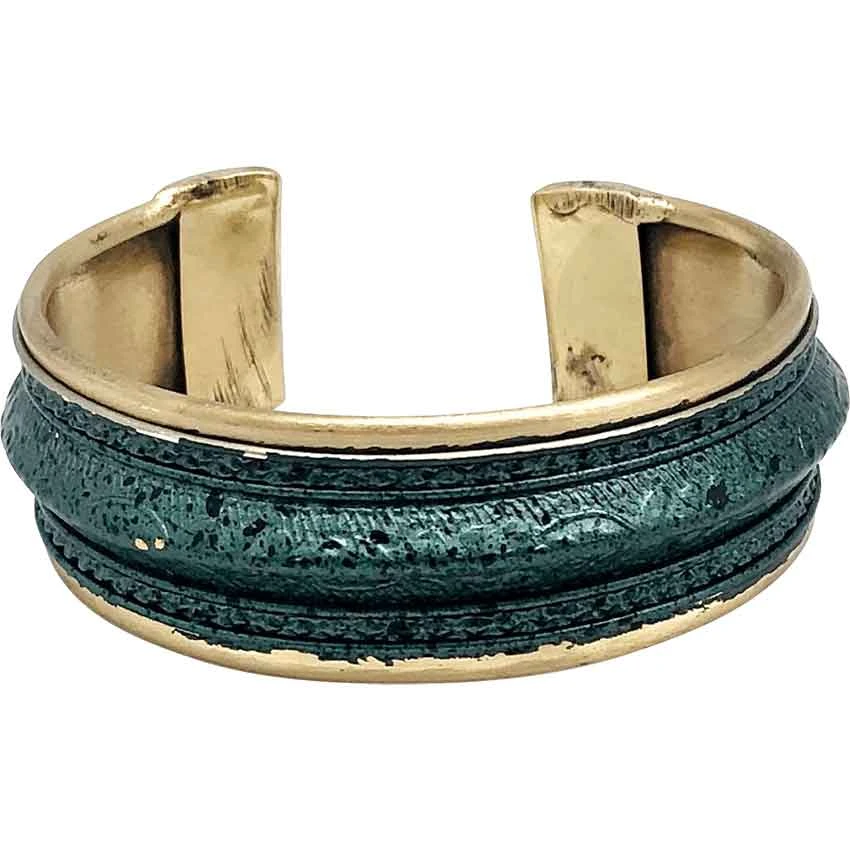 Whether you are a merchant or a part of the nobility, make sure to wear some accessories like the Perrine Medieval Patina Cuff Bracelet. Made from brass and copper, this cuff comes in one size. It is slightly adjustable. The bracelet has a cuff design, meaning that it looks like an open circle from the side. The bracelet has two flat ends. Along the outside, there are ridged borders near the edges. In the center, the bracelet is convex and extends outwards past the rest of the band. Raised texturing adorns this convex center. Both the borders and the center section have a rich, metallic blue-green patina. The contrast between the patina and brass edges creates a lovely look. This bracelet looks great with a variety of styles, including medieval and fantasy. You can even wear this wonderful piece of medieval jewelry with modern ensembles.