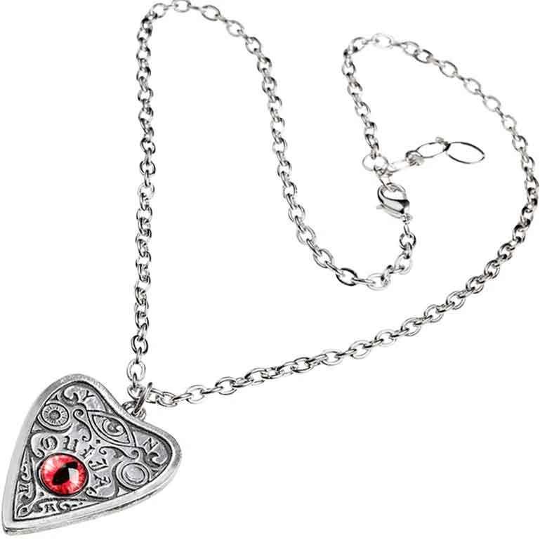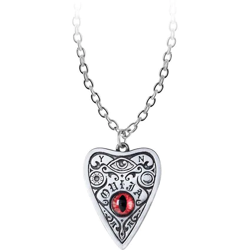 Enjoy Ouija boards or intrigued by their design? If so, then you should make sure that you check out the Petit Ouija Necklace. Made from fine English pewter, this necklace comes on a chain that fastens with a lobster clasp. The necklace takes the form of a planchette. A planchette is the pointer used with a Ouija board. This planchette has a red cats eye in the middle. Above the eye is the word Ouija. To the upper left, there is an image of the sun with the moon to its right. At the top of the planchette, there is a Y for yes and an N for No with a carved eye between them. Scrolled detailing adorns the planchette. You can add the Petit Ouija Necklace to your gothic wardrobe or Wiccan jewelry collection. It makes a great personal accessory.