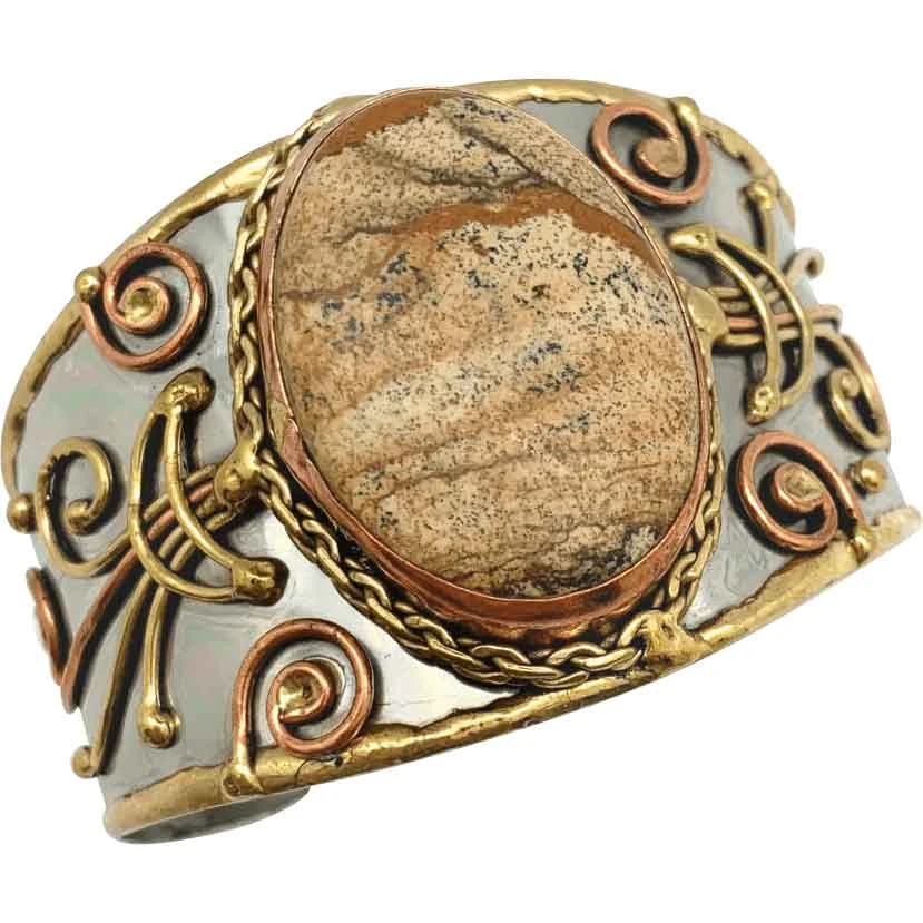 Queens, warriors, and other leaders know the power of the right accessory. Wear the Picture-Jasper Medieval Cuff Bracelet with your outfit. Handmade from stainless steel, this cuff comes in one size. It is slightly adjustable for a better fit. The bracelet has a cuff design, meaning that it looks like an open circle from the side. It has a large oval picture-jasper stone. The stone is in the center of the cuff. It has a copper border and a small brass chain around it.