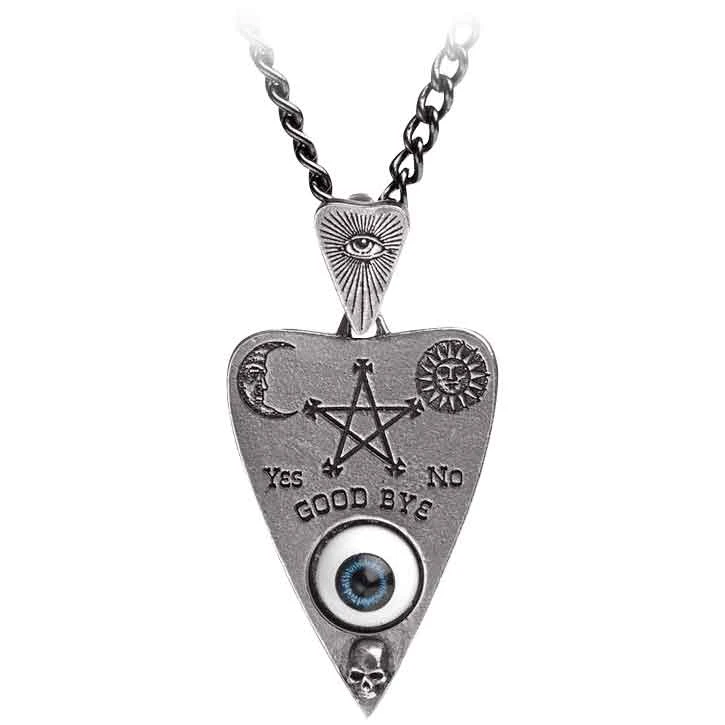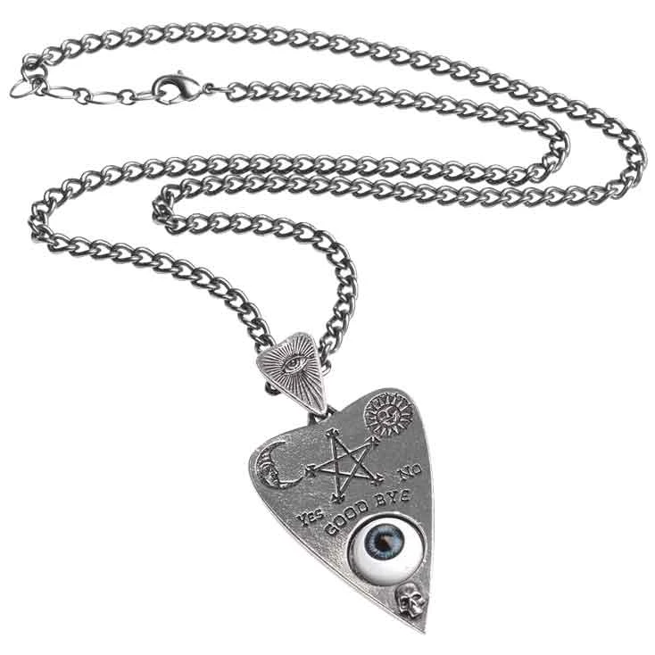 The Planchette Necklace resembles a 19th century spiritualists device for communicating with the dead during a seance. Also known as a Ouija pointer, a planchette was used with a talking board to divine mysteries from the other side. Handcrafted from fine English pewter, this pendant is engraved with mystical symbols, with the alphabet on the reverse side. A realistic acrylic eye has been set into the recess. The mystical pendant is suspended from a pewter bail on a blackened, 21 inch curb chain plus a 1.5 inch extender chain, with a clasp fastener. A charming personal accent or gift idea for anyone intrigued by Victorian spiritualism, the Planchette Necklace helps you keep an extra eye on your surroundings.