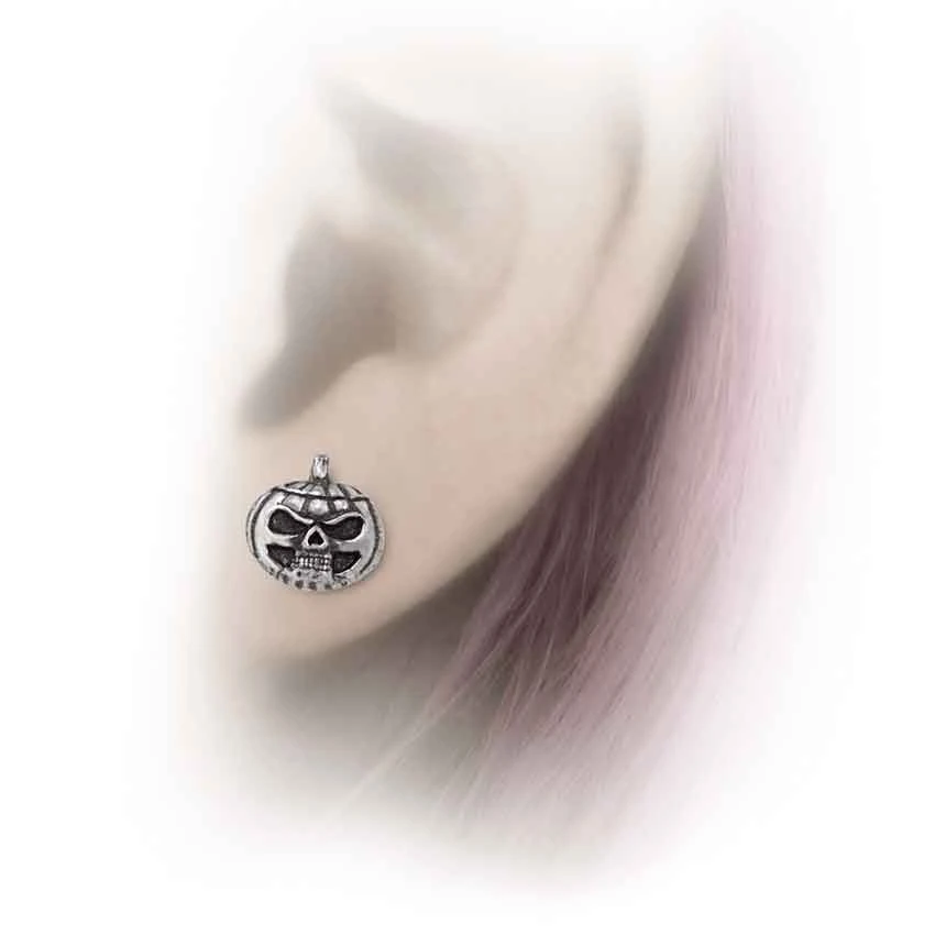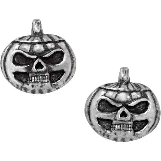 The Pumpkin Skull Stud Earrings make a lovely personal accessory to wear at Halloween or any time of year for some gothic style. Made from fine English pewter, these gothic earrings come as a pair. They have surgical-steel stud backings, which require pierced ears. Each earring depicts a pumpkin in the style of a jack-o-lantern. The pumpkin has a grinning skull-like face. It features darkened eye and nose sockets. The space around the skulls teeth is also darkened. These earrings are great for everyday wear. They work well with any gothic jewelry collection.