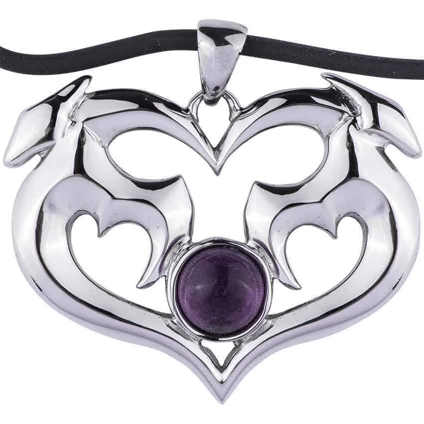 In bright metal shaped like a heart, The Dragon Heart Pendant is an inspired jewelry piece reminiscent of two dragons meeting around a deep purple crystal. Gift this sophisticated and elegant charm to your favorite dragon enthusiast. Its swirling curves feature angular tips reminiscent of the heads and wings of a dragon pair. Made of 316L stainless steel, this fantasy charm is attached to a wide loop, making it easy to string onto your favorite necklace chain, cord, or ribbon, should you wish to remove the included black cord. This thoughtful jewelry component can add an excellent touch of fantasy and romance to casual and special occasion outfits.