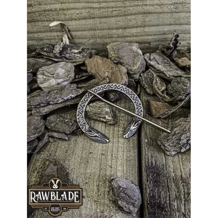 The loop features a pair of dragon heads at the ends. They help to keep the pin on the loop. A zigzag and dot pattern adorns the rest of the Viking brooch. Wear the Ragnarok Fibula Viking Brooch to a reenactment, faire, LARP event, and many other occasions.
