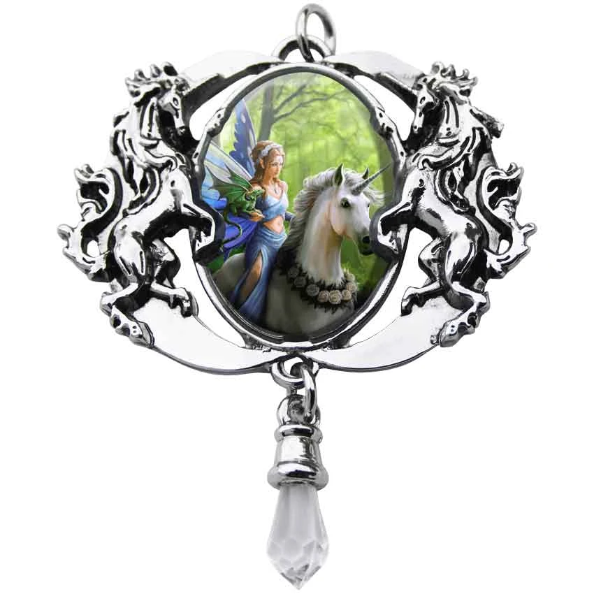 Gaze into a world where fairies reside in peace amongst dragons and unicorns within their shared forest home. Beautifully displayed within the center of the pendant, the Realm of Enchantment Cameo Necklace reveals such a scene from the work of fantasy artist Anne Stokes. This illustration, appearing in the oval shaped cameo, depicts a fairy maiden riding a unicorn with a green baby dragon perched on her arm. Rampant unicorns over crescent moons fittingly frame both sides of the oval cameo, turning the artwork into an ornate jewelry piece made of zinc alloy. Hanging from the bottom of the pendants frame, a clear, multifaceted dagger style crystal brings a mystic vibe to the necklace. This remarkable fantasy pendant is ready to be worn as a necklace, as it comes strung on a black satin ribbon with an adjustable back chain and lobster clasp. Incorporate fairytale magic into any look with this unique fantasy necklace, or gift it to a loved one who will delight in its lovely fairy theme and artistic intricacy.