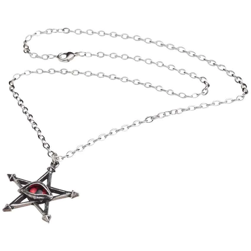 A powerful symbol of protection, the Evil Eye is intended to ward-off unmindful, malevolent curses from powerful enemies. Combined with a pentagram, like in the Red Curse Necklace, its power enhances tenfold, ensuring your safety. Made from fine English pewter, the pentagram that this Evil Eye is set onto features arrow-shaped spikes on each point. The eye itself is a red, synthetic snake eye set into a human-shaped eyelid. A round link attaches this mystical pendant to a trace chain. A dark and powerful symbol, this pewter pendant makes for a great addition to any ensemble and is a wonderful gift for any fan of Wiccan or Gothic fashion you may know!