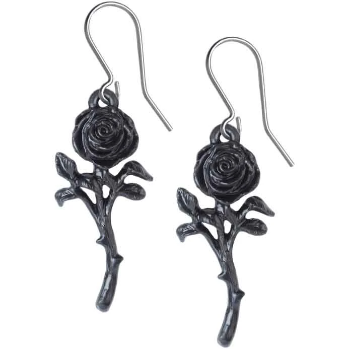 Some may prefer red roses while others long for black roses like the roses beautifully shown in the Romance of the Black Rose Earrings. Made from fine English pewter, these black earrings come as a pair. They have fishhook wires, which require pierced ears. The gothic earrings depict black roses with thorny stems. The tops of the roses have loops for the fishhook wires. Add these black rose earrings to any gothic outfit. You can also give them as a gift.