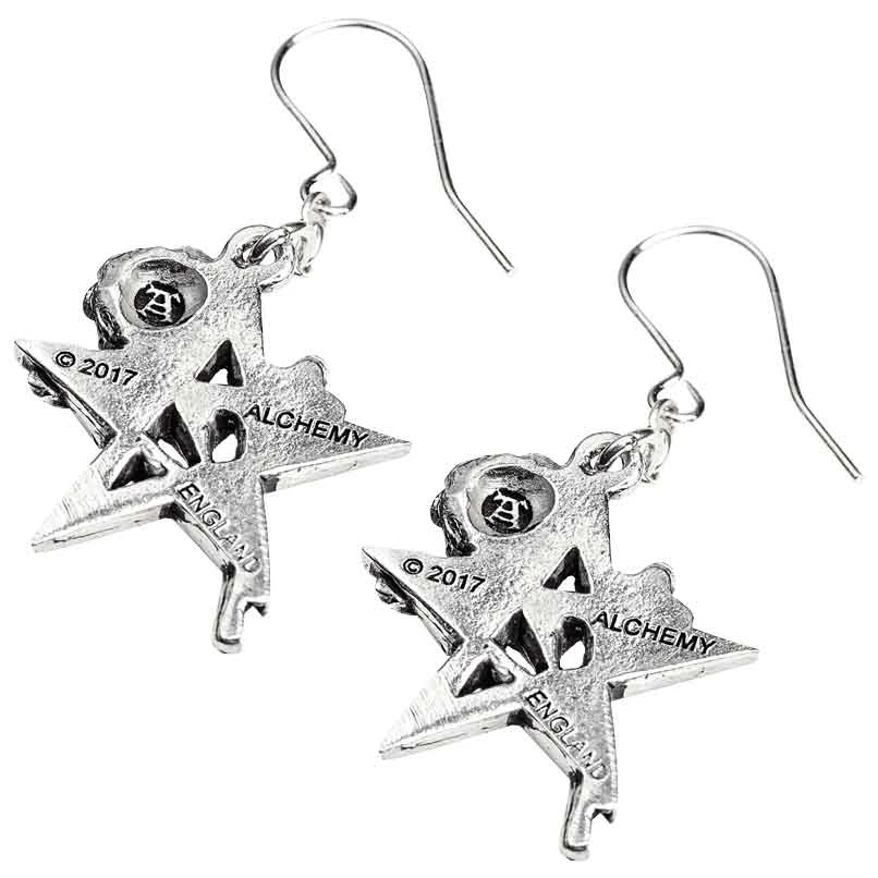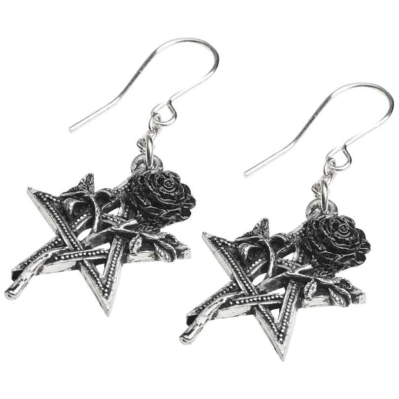 The Ruah Vered, a magical spell consisting of a pentagram and a single black rose, is intended to convey the favor of Eros, the god of desire, to any who wear it. Gain the favor of Eros, be desirable, with the Ruah Vered Earrings. These dropper style earrings depict detailed pentagrams entwined with black roses. Made from a fine English pewter, the Ruah Vereds hang from a chain on surgical steel wires. Perfect for any Wiccan or Gothic ensemble, these mystical earrings will make a great gift for a friend or loved one!