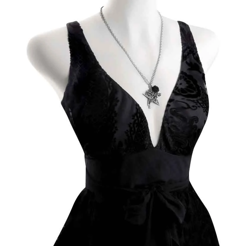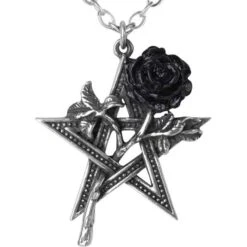 The pentagram represents the fifth element, the spirit or Breath of Life bound together with all nature. The Ruah Vered Necklace displays a romantic and sensual rose of love passionately entwined with a textured pentagram. This unique and mysterious symbol ensures health, harmony, and Erosean mystical powers to the wearer. The blooming rose is blackened to help it stand out against the gleaming, fine English pewter of the rest of the stem and pentagram design. The gothic pendant hangs from a trace chain, making it an easy addition to any of your favorite gothic ensembles.