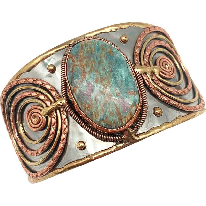 The stainless steel base of the bracelet is a wide cuff style that makes a statement. Because it is made by hand, it has an artisanal look that perfectly fits medieval and fantasy settings. The oval stone is set in the center and has a copper border. Then, lines of brass connect it with swirling copper and brass designs on either side.