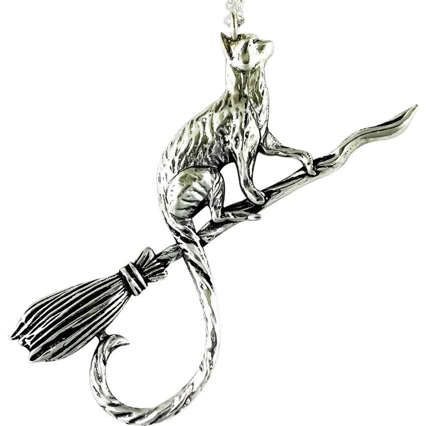 If you enjoy wearing a witchy accessory or have a Wiccan style, you are sure to love the look of the Sabbat Cat Necklace. Made from zinc alloy, this silver-plated necklace depicts a highly detailed cat riding on a broom. It faces right. The cats long tail curls below the witchs broom. At the top of the cats head, there is a bale that slides on the included link chain. The necklace comes with a satin pouch and an info card. The Sabbat Cat Necklace makes a great addition to any Wiccan jewelry collection or wardrobe.