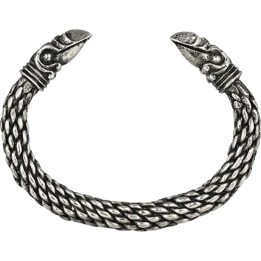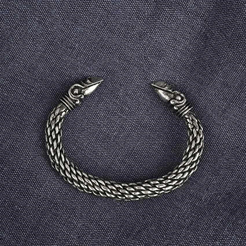 At each end of the open Norse bracelet, there is a stylized ravens head. The Nordic bracelet comes with care instructions. You can wear this Viking raven bracelet with a variety of Viking looks. It also makes a great addition to a Norse jewelry collection.