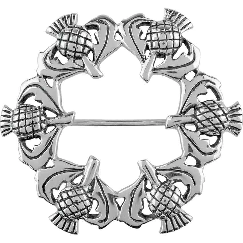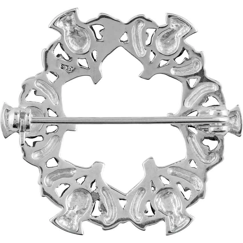 The national floral emblem of Scotland, the thistle, as seen in the Scottish Thistle Wreath Pin, displays a prickly blossom and leaves which supposedly alerted the Scots to a stealth invasion when one was stepped on. The pin shows a circular wreath of these flowers. Each bloom sits between a pair of curling leaves. The Celtic brooch works great as a personal accessory or gift for someone special. Made from white bronze, this flower pin is plated with sterling silver that gives it a bright gleam. Be sure to check out our other pieces of Scottish thistle jewelry for a complete look!